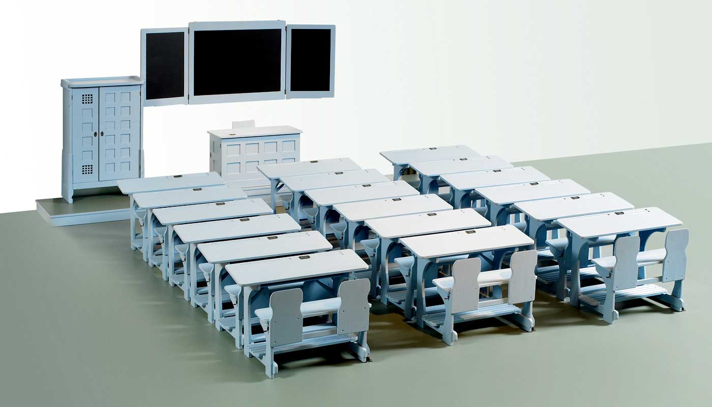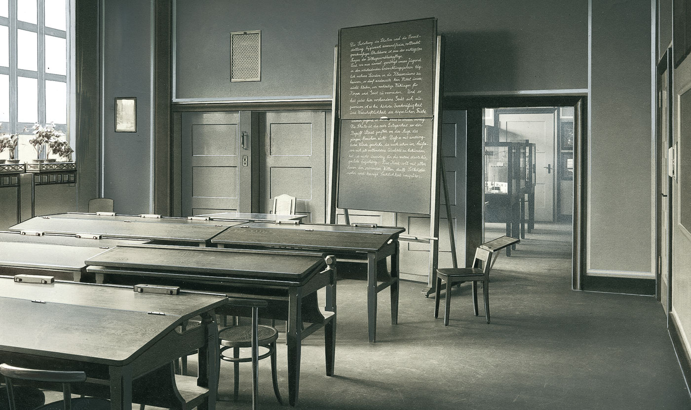 In collaboration with VS’s associate company, P. Johannes Müller, Richard Riemerschmid designed an integrated, light blue classroom with Rettig school benches for the Dresden Workshops exhibition.
