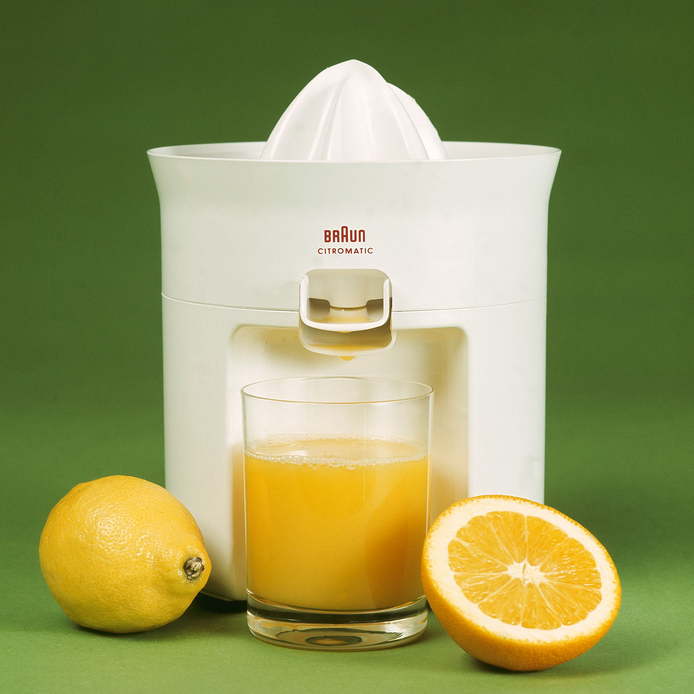 This was a pioneering design by Dieter Rams and Jürgen Greubel from 1972. The press of a button on the top to start the process, the juice flows directly into a container within a hollowed out area.