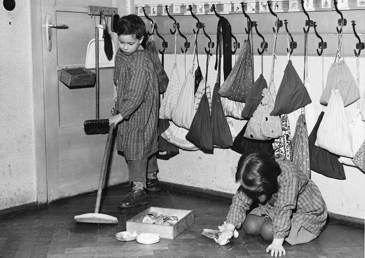 Housework is also one of life’s everyday activities. In all activities children’s attention needs to be in harmony with their movements and sense of appreciation of the task. Montessori Kindergarten, Berlin 1955.