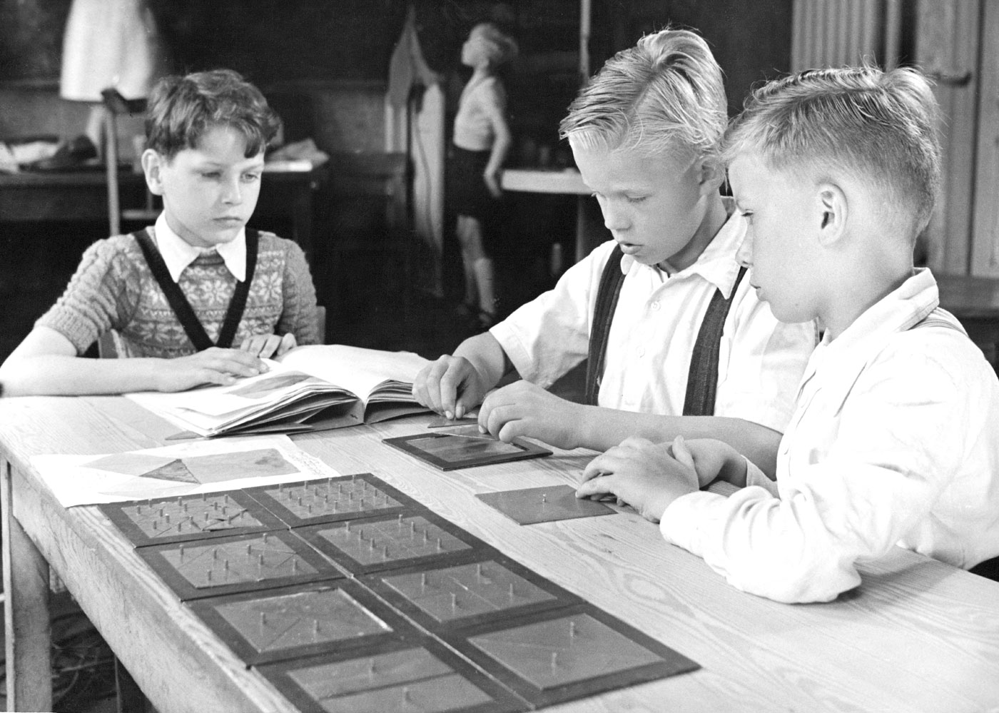 Learning with the aid of the senses: Pupils compare areas and lengths on geometric basic shapes and thus develop a sense of mathematical relationships. Montessori class, Berlin-Tegel, around 1950.