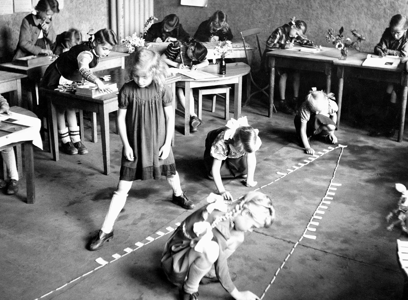 Montessori class, Berlin, 1949. Girls count the “thousand chains” to practice the decimal system. They mark off the distances between the hundreds.