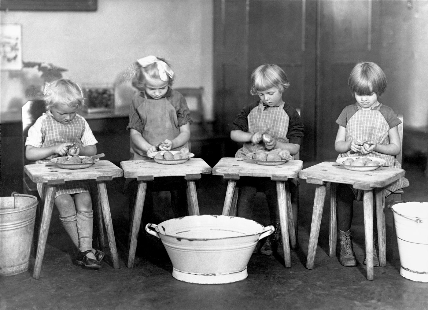 Peeling potatoes in a Children’s House, Berlin, 1920. Preparing and serving meals together and doing the dishes serve to help concentration and increase feelings of responsibility.