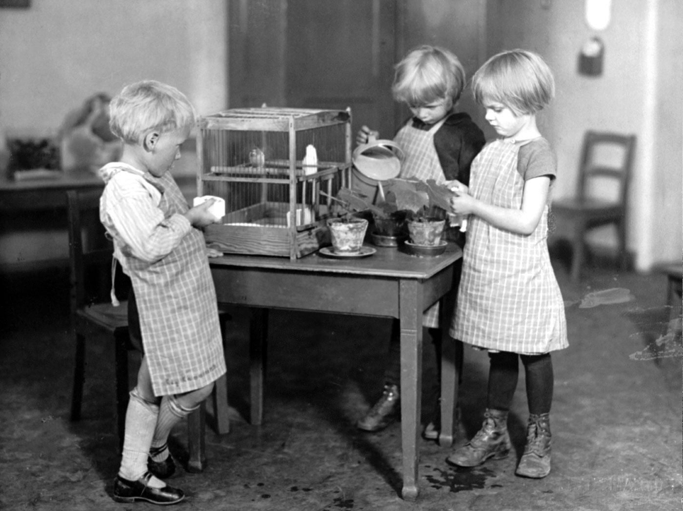 The children are looking after their bird and plants themselves, Children’s House Berlin, around 1920. They are learning that plants and animals need thoughtful and responsible care.