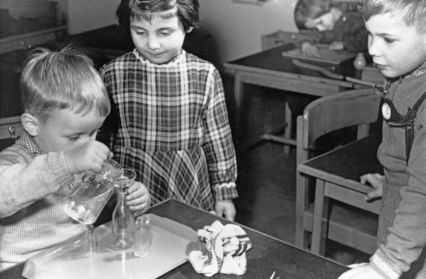 Independence and self-confidence: The boy is practicing pouring water from one container into another, preferably without spilling any. Children’s House, Berlin, 1961.