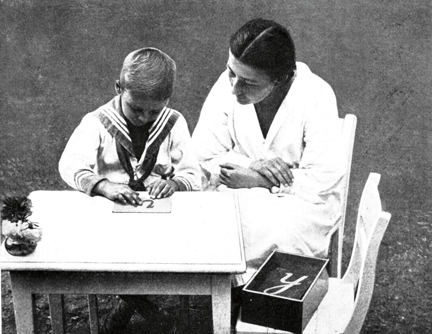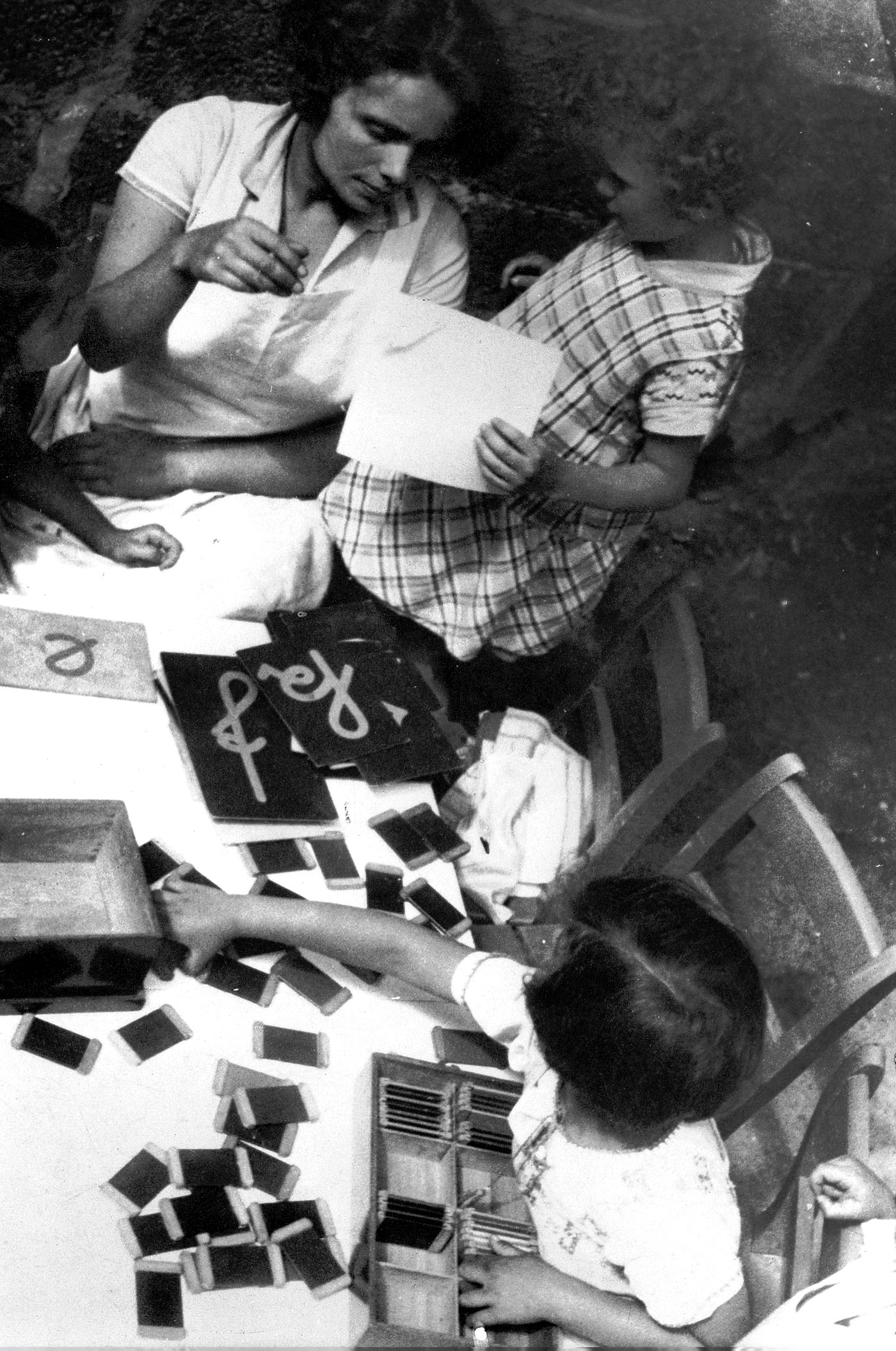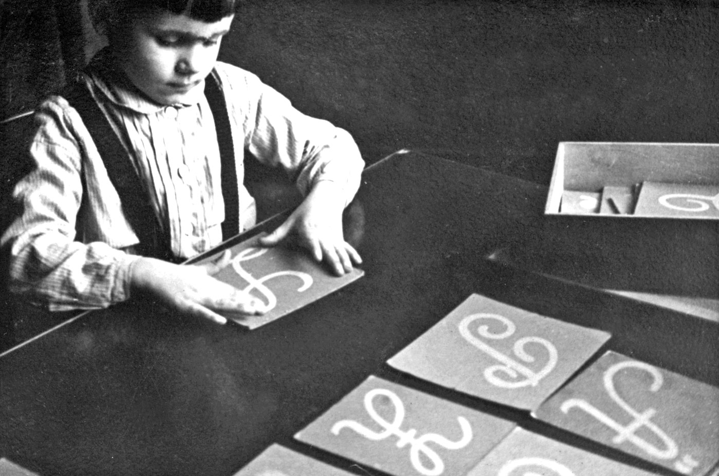 Using his/her fore and middle finger, the child follows the shape of the letters and utters the appropriate sound. Children’s House, Berlin, around 1927.