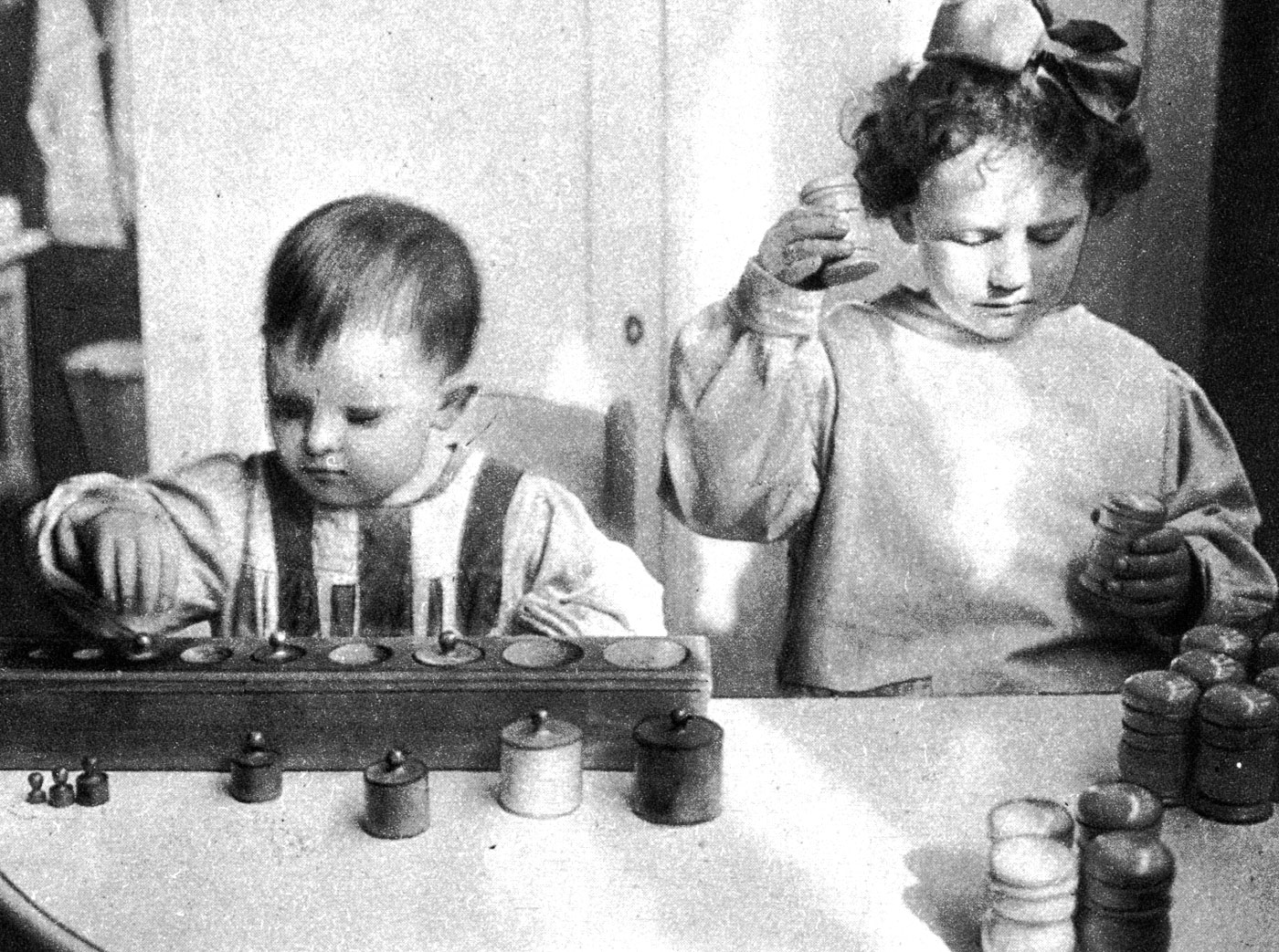 Children are no longer the object of education but self-determining subjects who are able, in a suitable environment, to choose activities according to their own particular stage of development. At every stage receptivity to acquire certain sensual skills is especially pronounced. Children with their teacher enjoy an activity with rattle boxes – sensual materials to development the auditory and musical senses. Children’s House at the Fröbelseminar, Hamburg, around 1930.