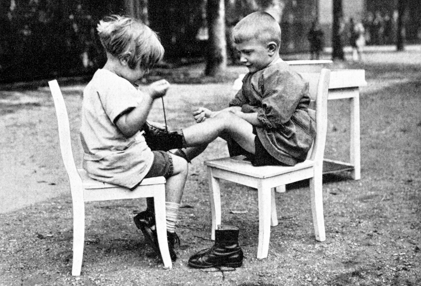 Children’s House, Leopoldplatz, Berlin-Wedding, 1928. Children are helping each other tie their shoe-laces – it encourages mutual respect and social responsibility.