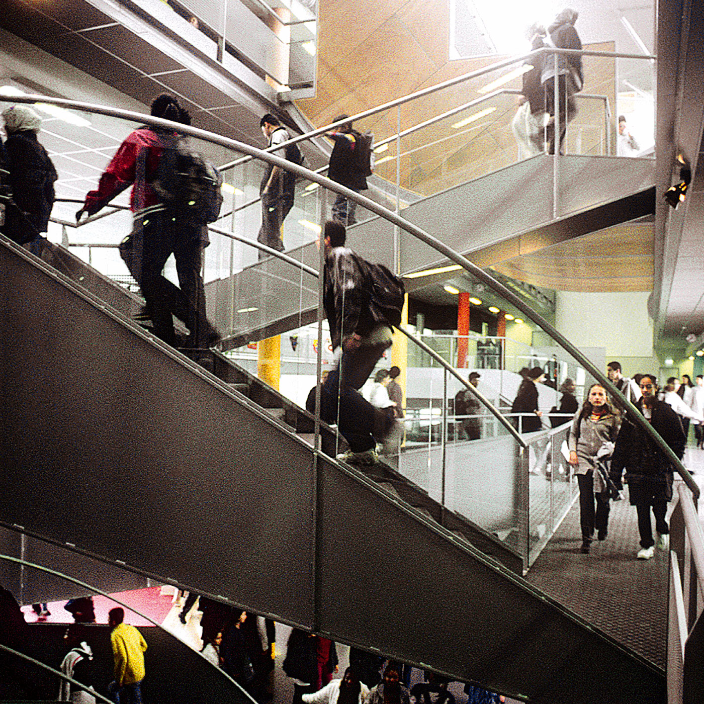 View into the atrium of the classroom block where there are wide corridors and spacious stairways positioned offset to each other connecting with a dense mesh of routes and communication networks.