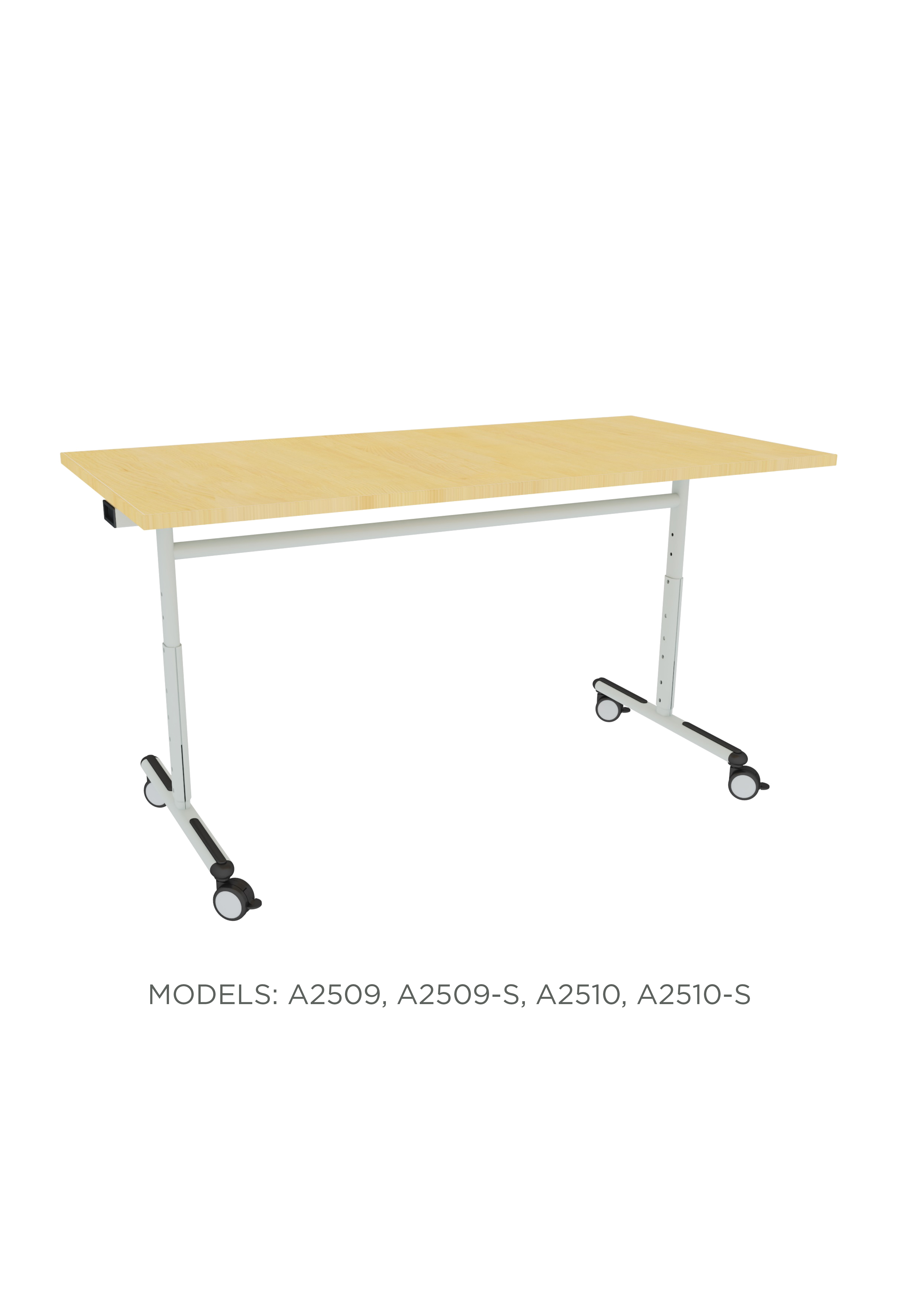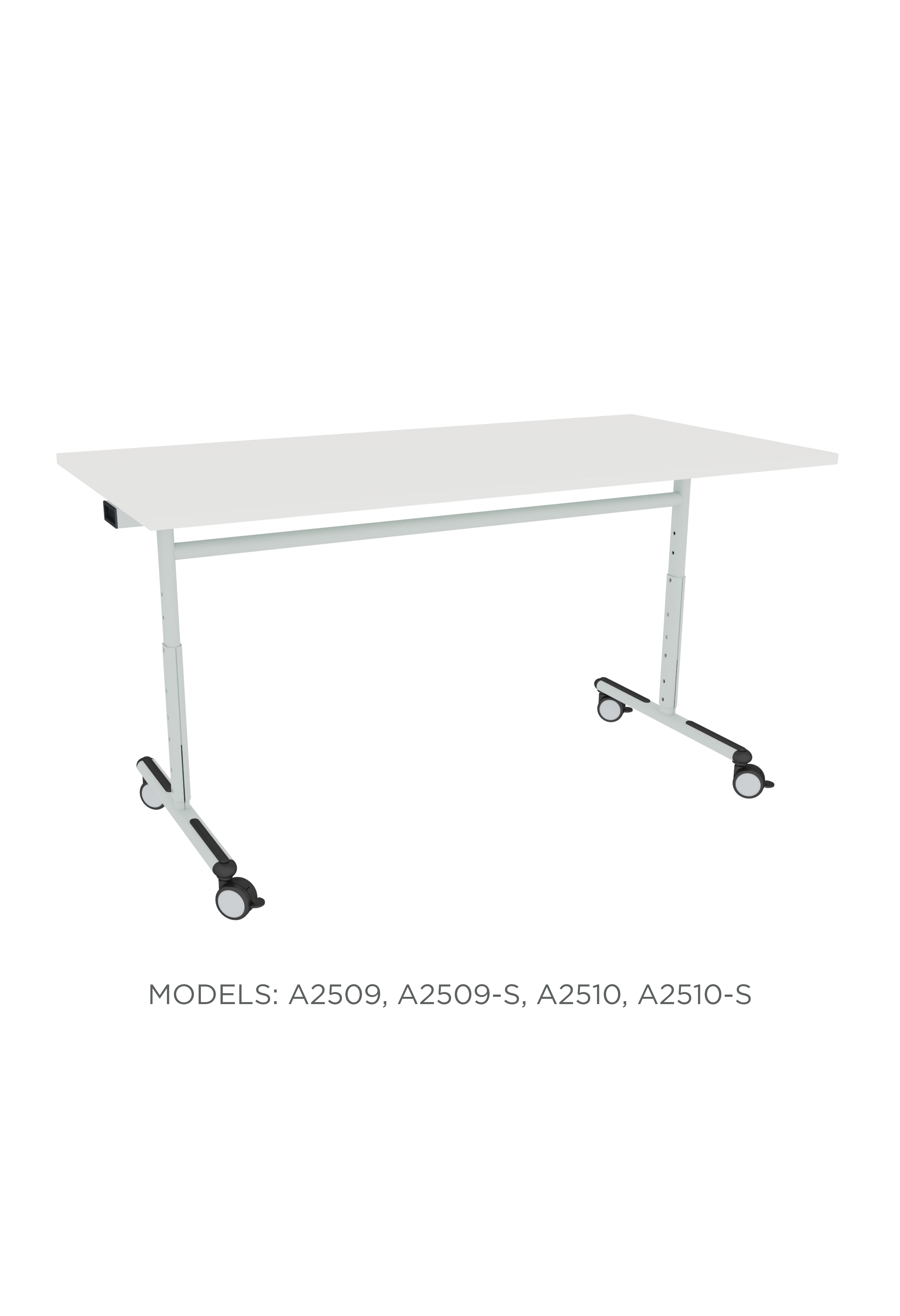 The FlipTable is constructed of a centrally positioned tubular-steel cross-piece with an articulated bracket. The two-lever safety mechanism ensures the table is never flipped by accident, and the top locks when horizontal or flipped for added safety. This table provides extreme functionality for all learning environments with the added benefit of step height adjustment with hexagon key locking.