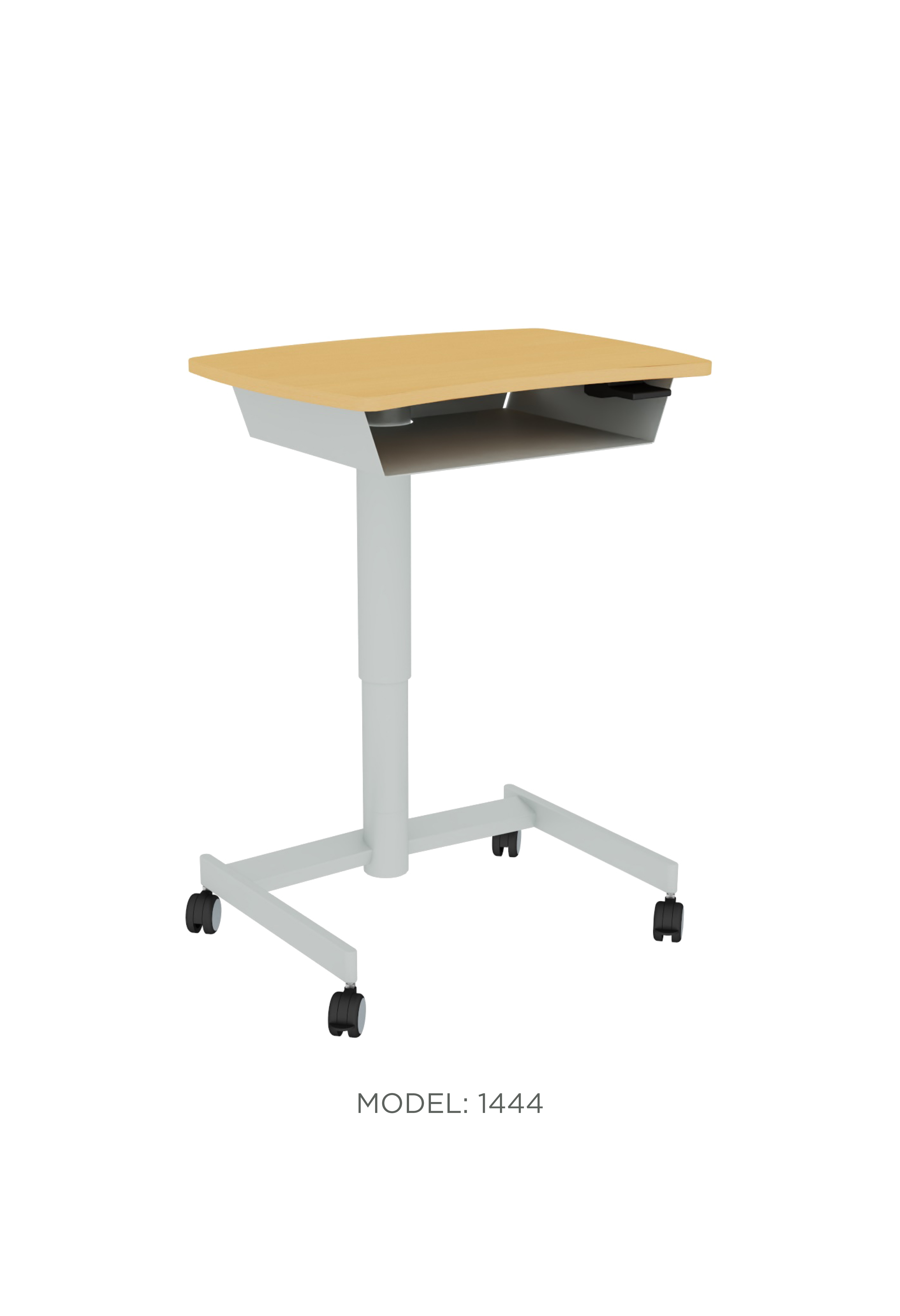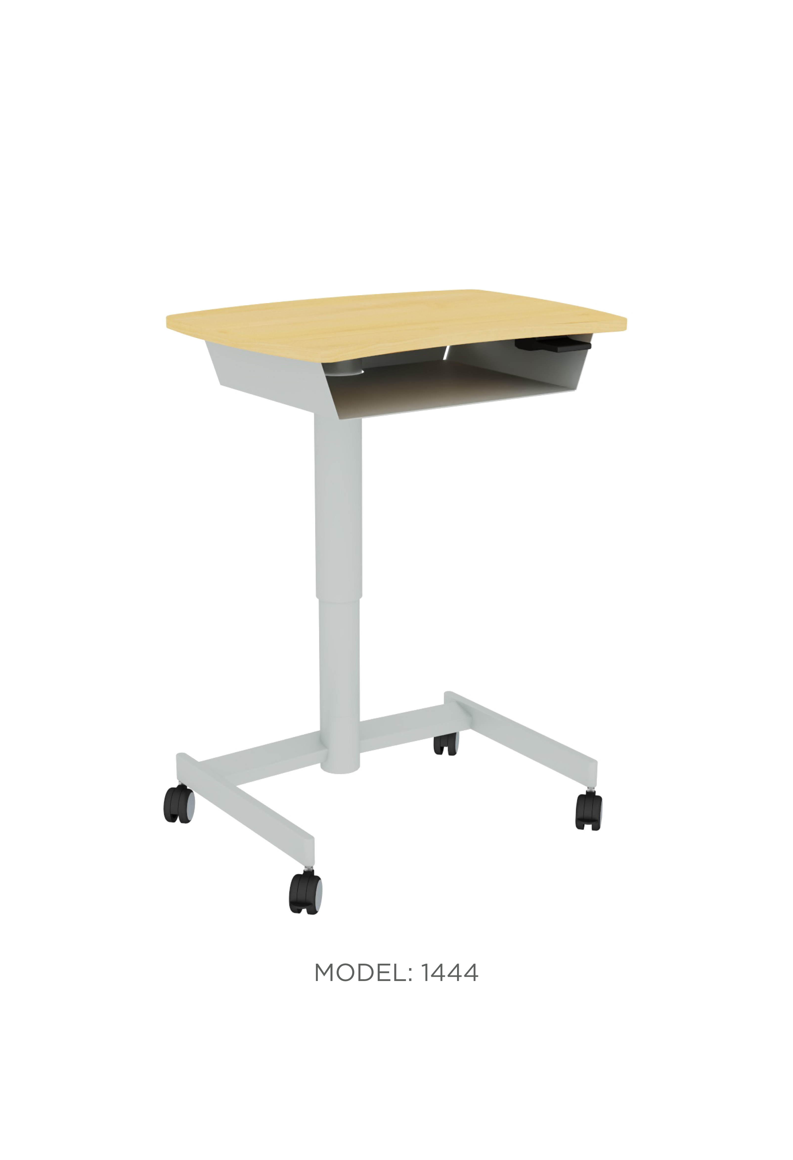 The Interact has a curved top that fits all other Shift+ product curves, so it can nest with other desks and tables in an unlimited set of configurations. The height can be quickly adjusted from 28” to 45 1/4”, and the castors make it easy to move around the room. A closed book box under the table offers convenient storage on the go.