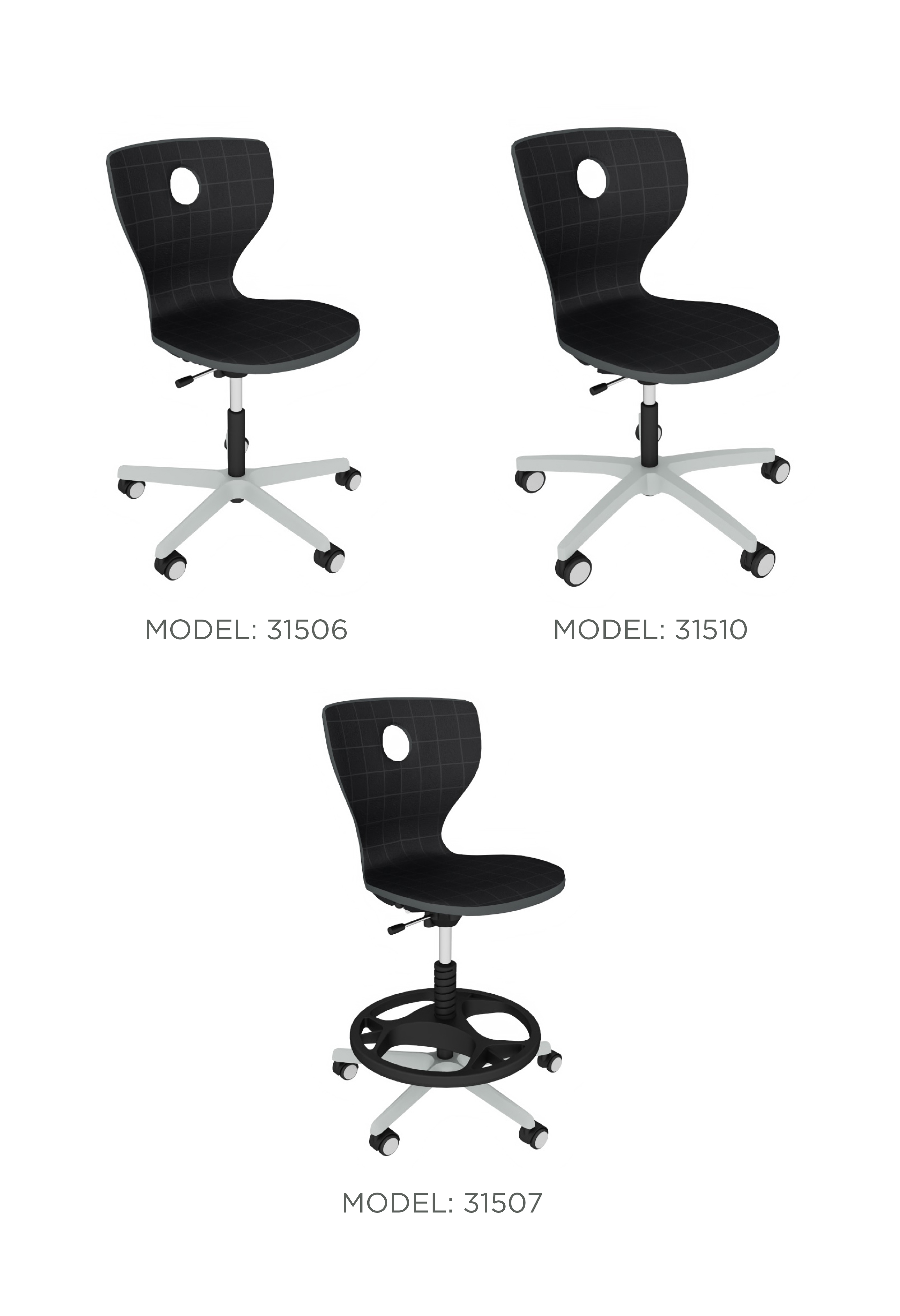 The Solo stool is available in four fixed sitting heights of 18 1/8”, 20 1/8”, 24”, and 30", and has 4 foot rings positioned at different heights for use as footrests. These foot rings make the Solo stool easy to be used by students of all heights. This stool can be stacked up to 5 at a time.
