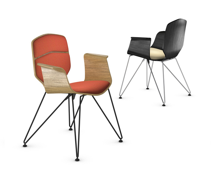 The Stratos plywood shell can also be combined with seat padding or seat and back padding. The choice here includes high quality fabric and leather, their clear color lending additional visual emphases.